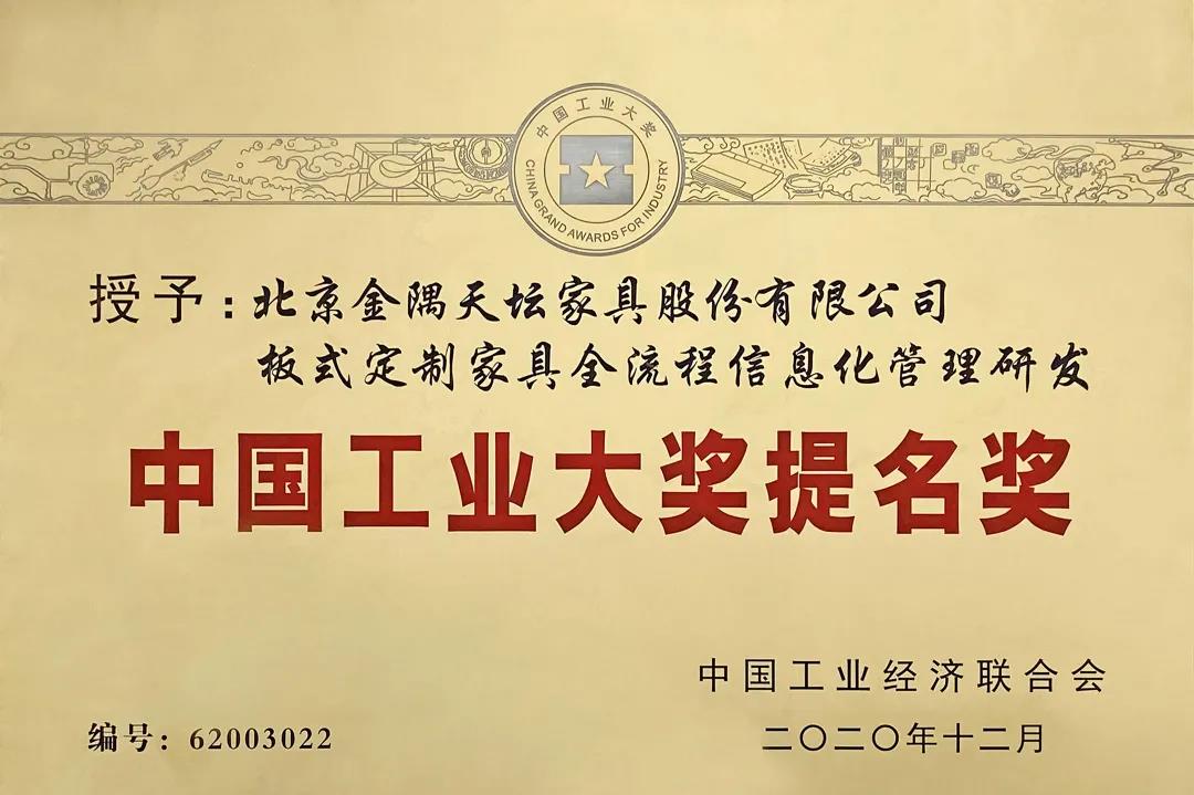 2020年,金隅天壇板式定制全流程信息化管理平臺榮獲中國工業大獎提名獎,獲批第一批北京市高精尖產業發展資金項目;金隅天壇工業4.0智能制造加工中心先后被廊坊市、河北省認定為市級、省級數字化車間;天壇家具榮獲2020年度建材行業智能制造示范企業、建材制造業與互聯網融合發展試點示范企業……